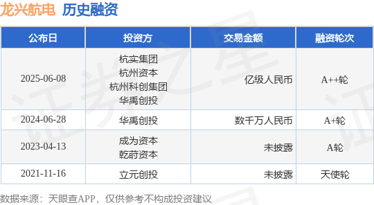证券之星消息,根据天眼查APP于6月8日公布的信息整理,龙兴(杭州)航空电子有限公司A++轮融资,融资额亿级人民币,参与投资的机构包括杭实集团,杭州资本,杭州科创集团,华禹创投,投后估值10亿人民币。