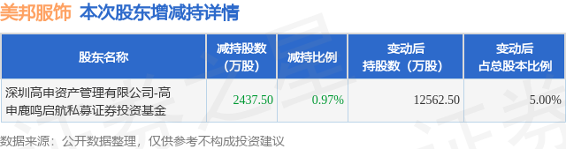 证券之星消息,6月11日美邦服饰发布公告《美邦服饰:简式权益变动报告书(高申鹿鸣)》,其股东深圳高申资产管理有限公司-高申鹿鸣启航私募证券投资基金于2025年5月22日至2025年6月10日间合计减持2437.5万股,占公司目前总股本的0.9702%,变动期间该股股价下跌2.7%,截止6月10日收盘报1.8元。