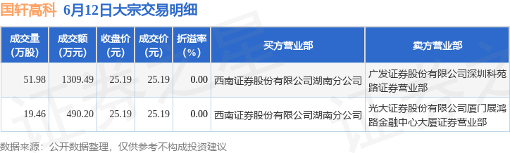 证券之星消息,6月12日国轩高科发生大宗交易,交易数据如下: