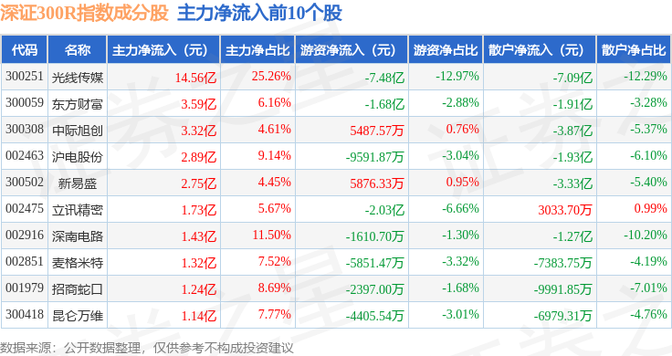 资金流向方面,深证300R(399344)指数成份股当日主力资金净流入合计17.25亿元,游资资金净流出合计27.53亿元,散户资金净流入合计10.27亿元。成份股资金流向详情见下表: