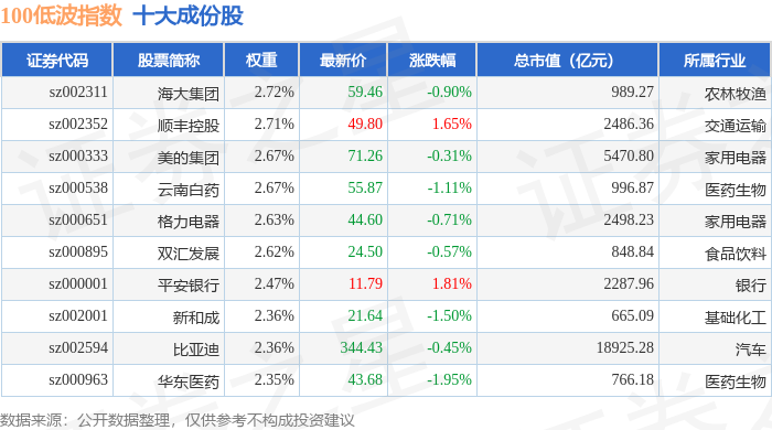 资金流向方面,100低波(399645)指数成份股当日主力资金净流出合计6760.72万元,游资资金净流出合计8974.5万元,散户资金净流入合计1.57亿元。成份股资金流向详情见下表: