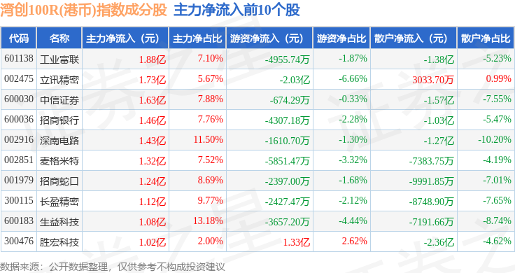 资金流向方面,湾创100R(港币)(480002)指数成份股当日主力资金净流入合计6.48亿元,游资资金净流出合计7.05亿元,散户资金净流入合计5687.84万元。成份股资金流向详情见下表: