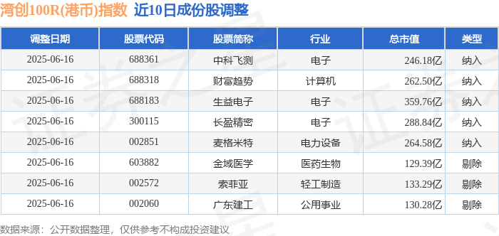 近10日内湾创100R(港币)(480002)指数成份股做了调整,新纳入了5只股票,剔除了3只股票。