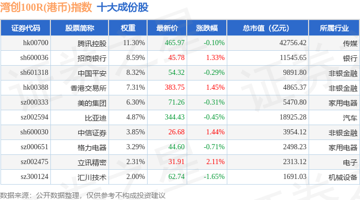 湾创100R(港币)(480002)指数十大成份股详情如下: