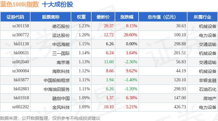 资金流向方面,蓝色100R(480068)指数成份股当日主力资金净流出合计1.36亿元,游资资金净流出合计1.38亿元,散户资金净流入合计2.75亿元。成份股资金流向详情见下表: