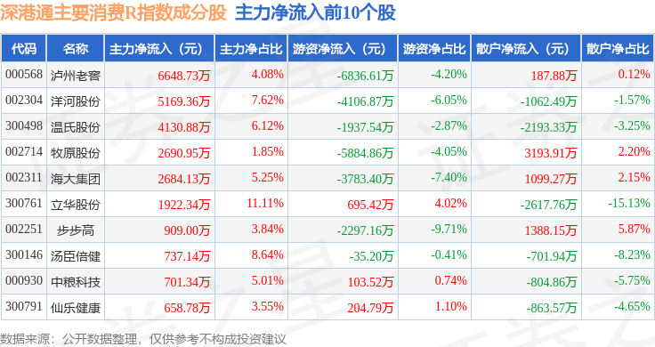 资金流向方面,深港通主要消费R(483021)指数成份股当日主力资金净流出合计3.01亿元,游资资金净流出合计3.66亿元,散户资金净流入合计6.67亿元。成份股资金流向详情见下表: