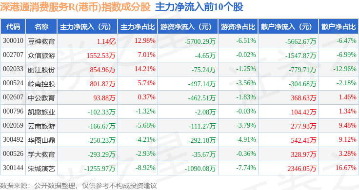 资金流向方面,深港通消费服务R(港币)(483046)指数成份股当日主力资金净流入合计8267.13万元,游资资金净流出合计7547.85万元,散户资金净流出合计719.28万元。成份股资金流向详情见下表:
