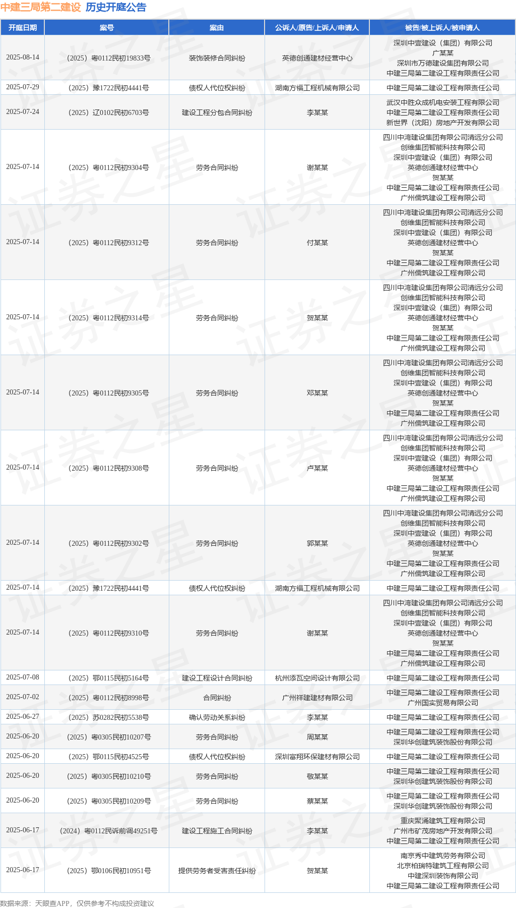 案号:(2025)鄂0115民初4525号根据统计,近一年内以中建三局第二建设工程有限责任公司为当事人的历史开庭公告有242则,其中案由为“劳务合同纠纷”的公告以55则居首,其次为“建设工程合同纠纷”有29则,“建设工程分包合同纠纷”有26则。历史开庭公告(前20条)如下: