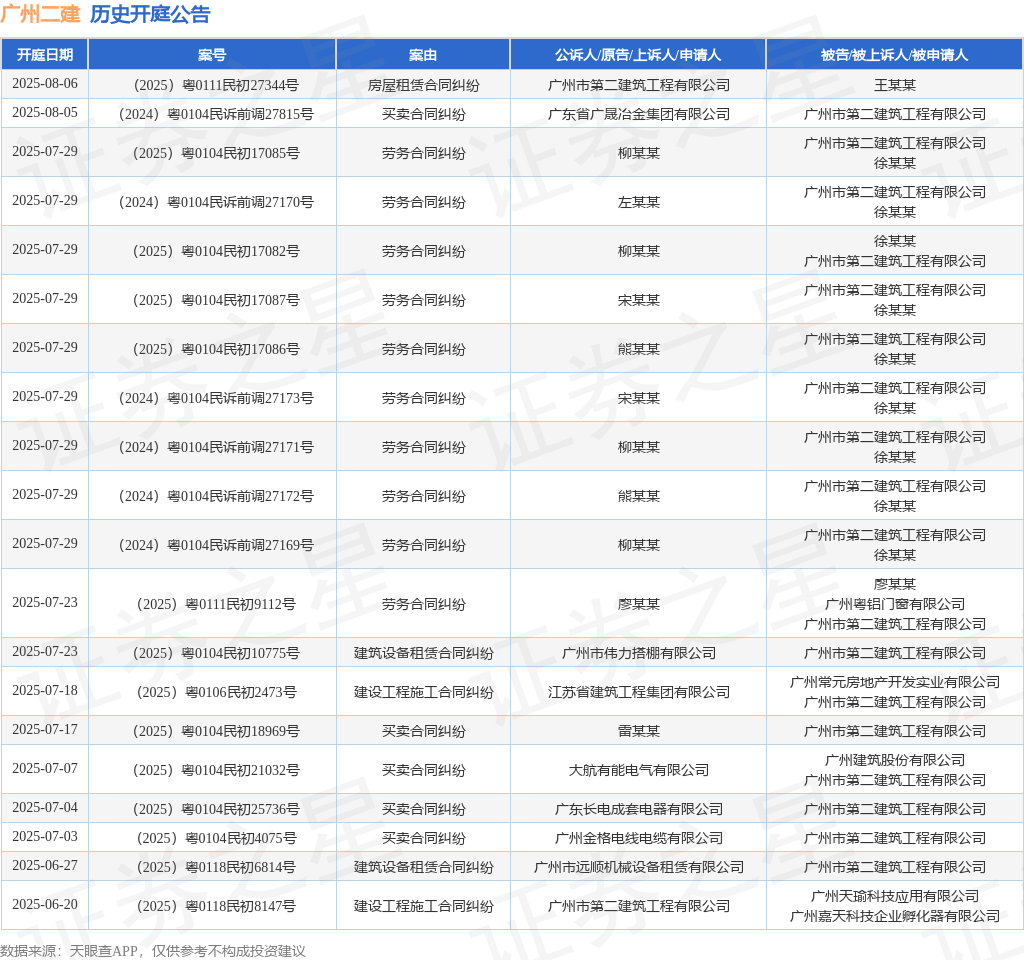 案号:(2025)粤0118民初8147号根据统计,近一年内以广州市第二建筑工程有限公司为当事人的历史开庭公告有164则,其中案由为“买卖合同纠纷”的公告以77则居首,其次为“劳务合同纠纷”有21则,“建设工程施工合同纠纷”有20则。历史开庭公告(前20条)如下: