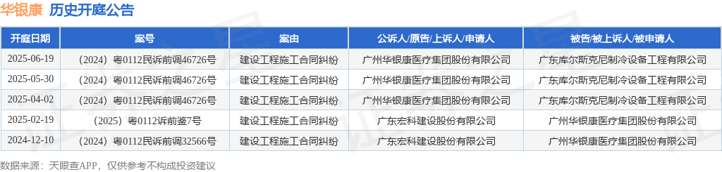 根据统计,近一年内以广州华银康医疗集团股份有限公司为当事人的历史开庭公告有5则,其中案由为“建设工程施工合同纠纷”的公告以5则居首。历史开庭公告如下: