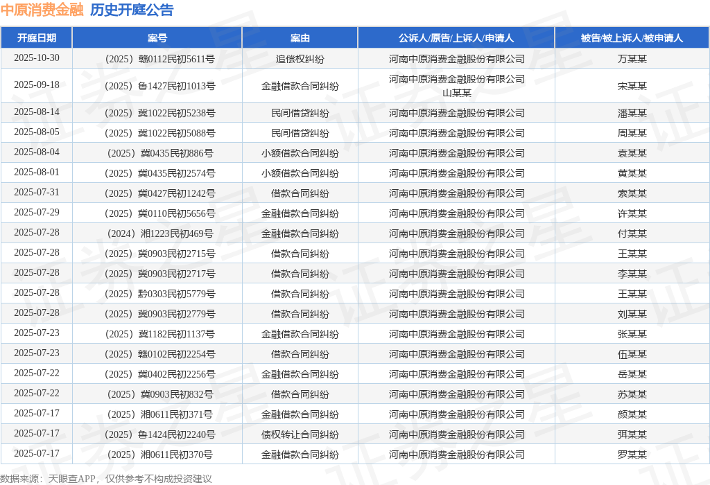 案号:(2025)冀0728民初605号根据统计,近一年内以河南中原消费金融股份有限公司为当事人的历史开庭公告有2229则,其中案由为“金融借款合同纠纷”的公告以1432则居首,其次为“借款合同纠纷”有473则,“小额借款合同纠纷”有135则。历史开庭公告(前20条)如下:
