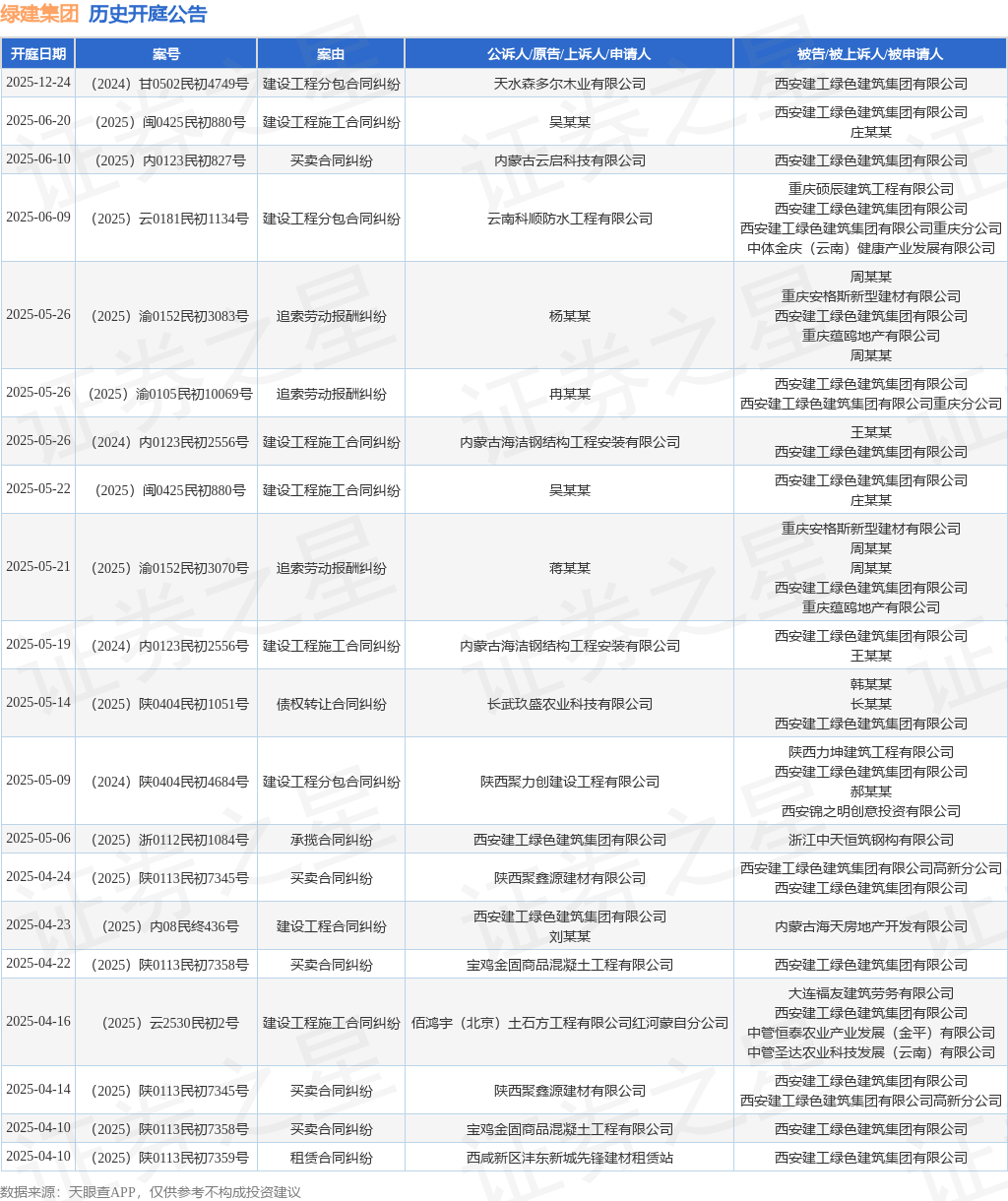 案号:(2025)闽0425民初880号根据统计,近一年内以西安建工绿色建筑集团有限公司为当事人的历史开庭公告有139则,其中案由为“买卖合同纠纷”的公告以49则居首,其次为“建设工程施工合同纠纷”有23则,“劳务合同纠纷”有17则。历史开庭公告(前20条)如下: