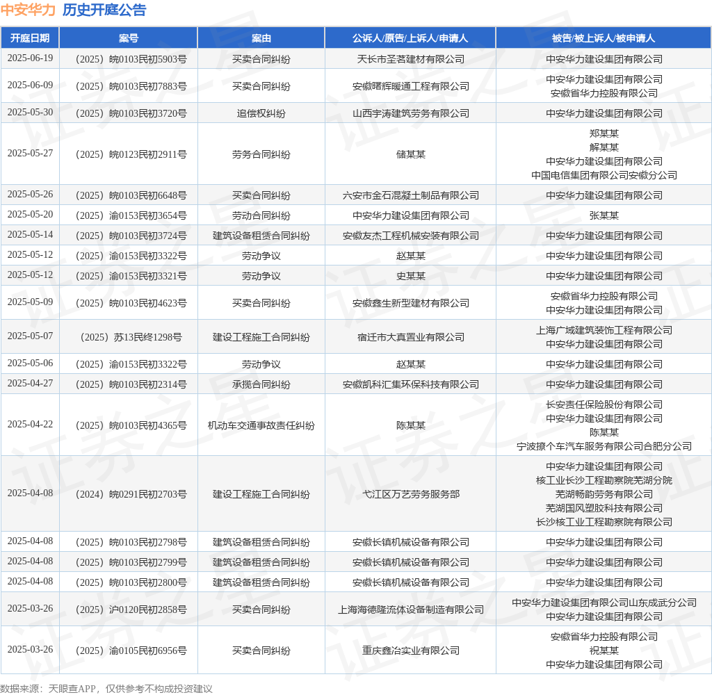 案号:(2025)皖0103民初5903号根据统计,近一年内以中安华力建设集团有限公司为当事人的历史开庭公告有81则,其中案由为“买卖合同纠纷”的公告以28则居首,其次为“建设工程施工合同纠纷”有9则,“劳务合同纠纷”有8则。历史开庭公告(前20条)如下:
