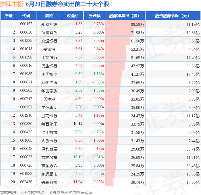 沪深主板融券净卖出前三分别为:永泰能源(600157)融券净卖出99.59万股、铜陵有色(000630)融券净卖出71.98万股、交通银行(601328)融券净卖出61.5万股,前20具体见下表:
