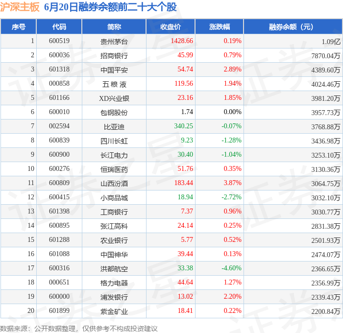 沪深主板融券余额前三分别为:贵州茅台(600519)融券余额1.09亿元、招商银行(600036)融券余额7870.04万元、中国平安(601318)融券余额4389.6万元,前20具体见下表: