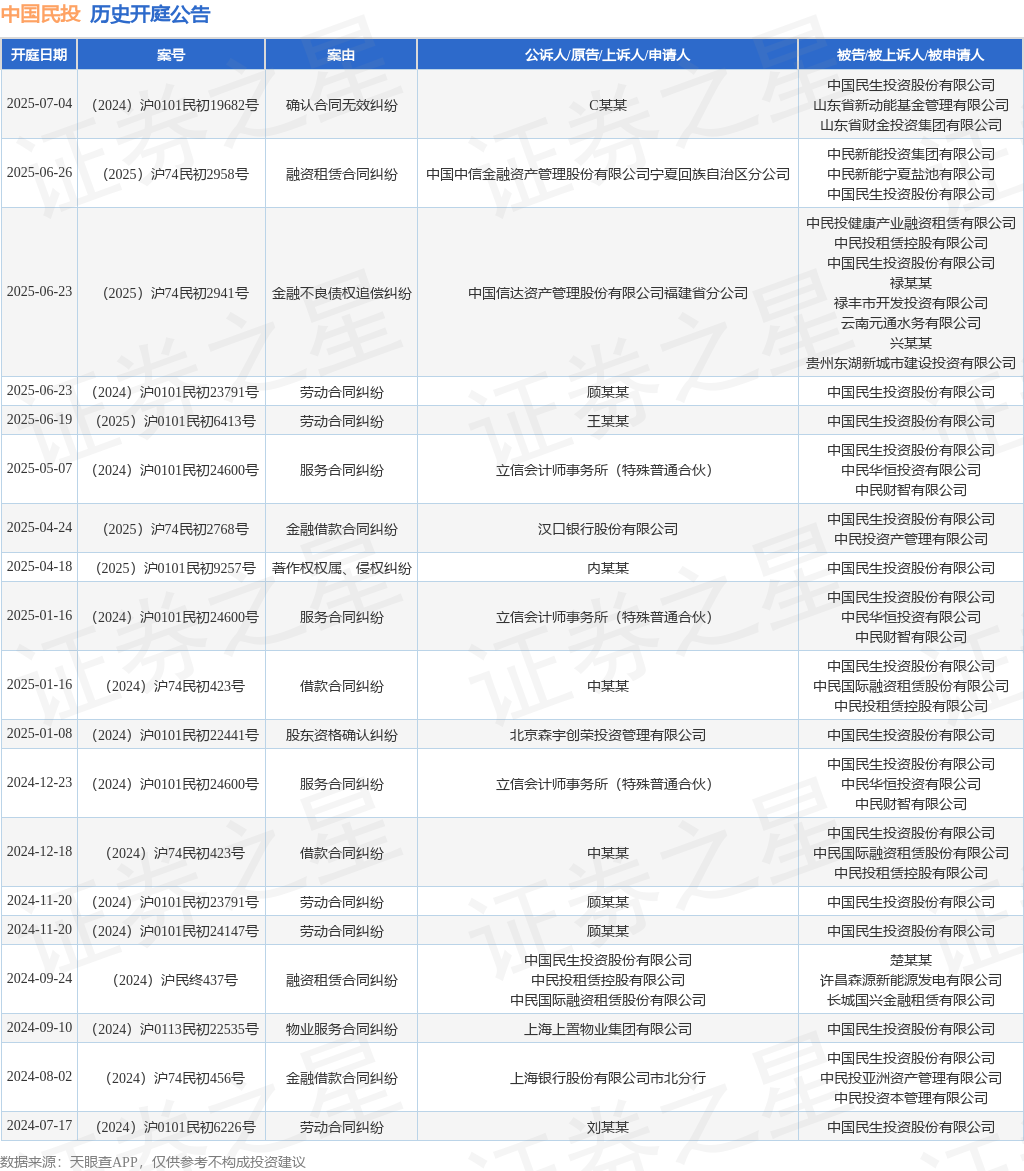 案号:(2025)沪74民初2958号根据统计,近一年内以中国民生投资股份有限公司为当事人的历史开庭公告有19则,其中案由为“劳动合同纠纷”的公告以5则居首,其次为“服务合同纠纷”有3则,“借款合同纠纷”有2则。历史开庭公告如下: