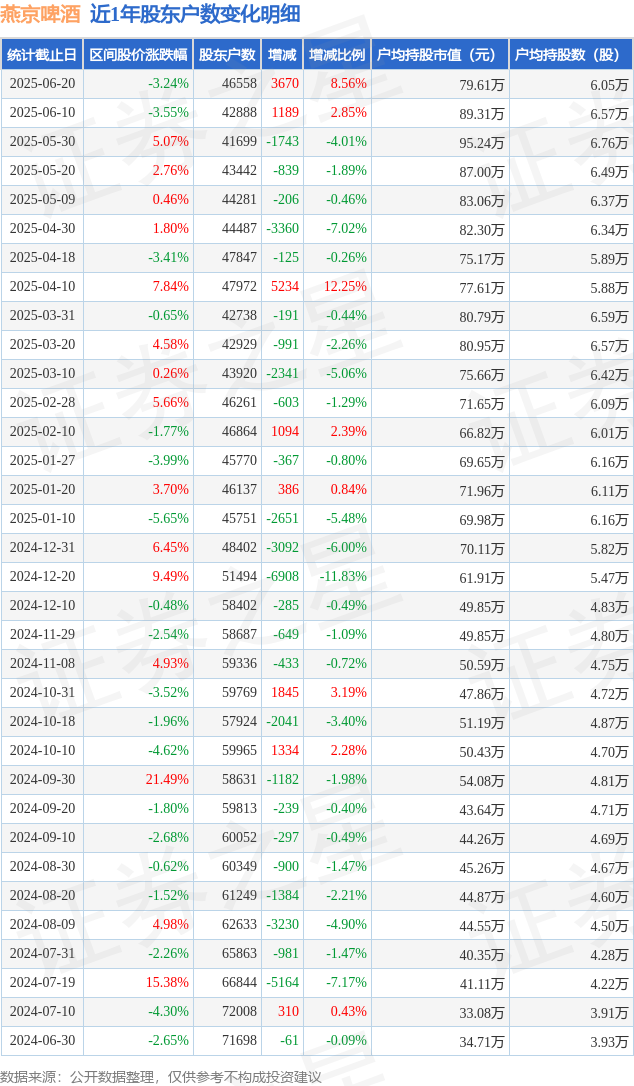从股价来看,2025年6月10日至2025年6月20日,燕京啤酒区间跌幅为3.24%,在此期间股东户数增加3670.0户,增幅为8.56%。