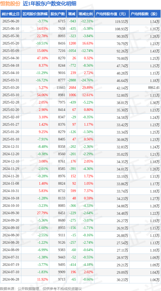 从股价来看,2025年6月10日至2025年6月20日,恒勃股份区间跌幅为3.77%,在此期间股东户数减少943.0户,减幅为12.31%。