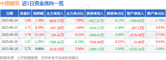 证券之星消息,截至2025年6月24日收盘,中国建筑(601668)报收于5.8元,上涨1.58%,换手率0.48%,成交量196.52万手,成交额11.35亿元。