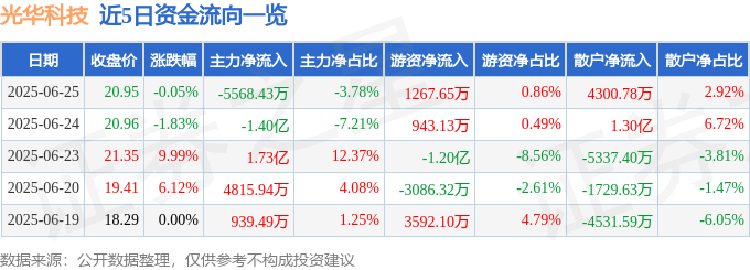 证券之星消息,截至2025年6月25日收盘,光华科技(002741)报收于20.95元,下跌0.05%,换手率16.36%,成交量69.76万手,成交额14.71亿元。