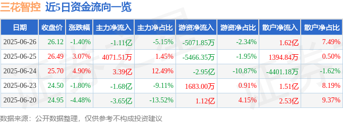 6月26日的资金流向数据方面,主力资金净流出1.11亿元,占总成交额5.15%,游资资金净流出5071.85万元,占总成交额2.34%,散户资金净流入1.62亿元,占总成交额7.49%。