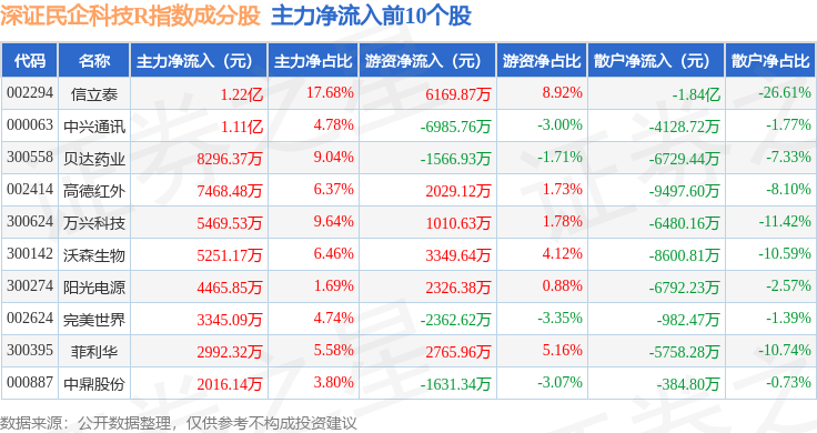 资金流向方面,深证民企科技R(470059)指数成份股当日主力资金净流出合计20.85亿元,游资资金净流入合计5.04亿元,散户资金净流入合计15.81亿元。成份股资金流向详情见下表: