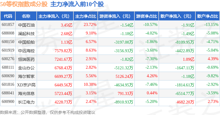 资金流向方面,50等权(000050)指数成份股当日主力资金净流出合计27.6亿元,游资资金净流入合计6.32亿元,散户资金净流入合计21.29亿元。成份股资金流向详情见下表: