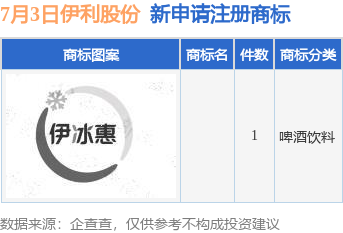 证券之星消息,根据天眼查APP数据显示,近日内蒙古伊利实业集团股份有限公司新提交1件商标注册申请。商标申请详情如下: