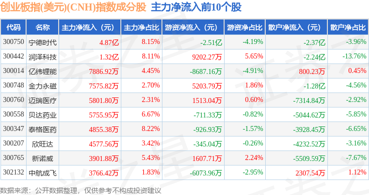 资金流向方面,创业板指(美元)(CNH)(970007)指数成份股当日主力资金净流出合计45.73亿元,游资资金净流入合计16.61亿元,散户资金净流入合计29.12亿元。成份股资金流向详情见下表: