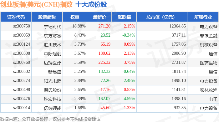 创业板指(美元)(CNH)(970007)指数十大成份股详情如下: