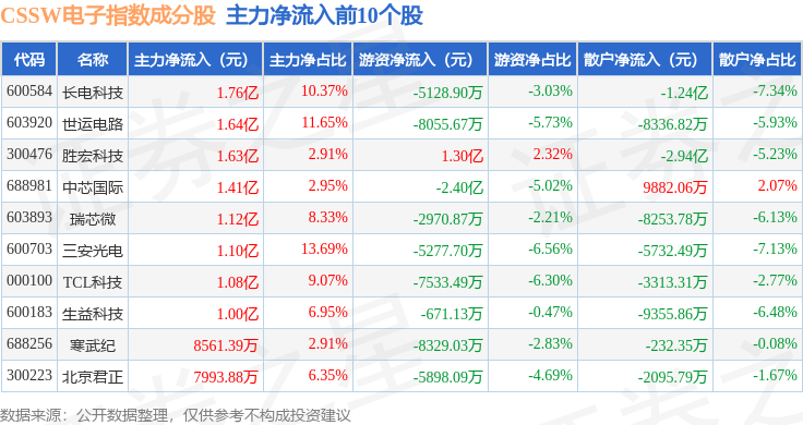 资金流向方面,CSSW电子(399811)指数成份股当日主力资金净流入合计6.29亿元,游资资金净流出合计6.53亿元,散户资金净流入合计2398.15万元。成份股资金流向详情见下表:
