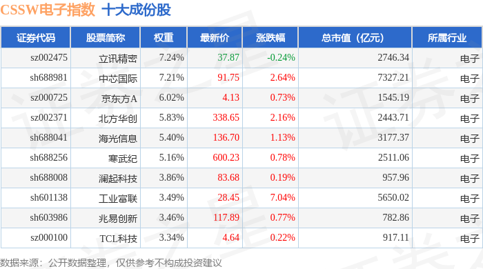 CSSW电子(399811)指数十大成份股详情如下: