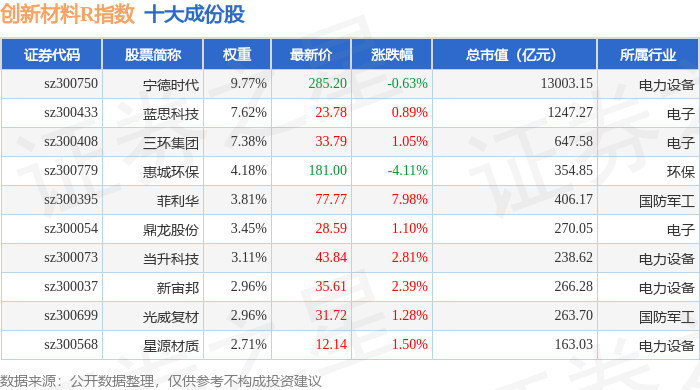 证券之星消息,7月24日,创新材料R(470039)指数报收于4540.54点,涨1.89%,成交370.98亿元,换手率3.4%。当日该指数成份股中,上涨的有44家,菲利华以7.98%的涨幅领涨,下跌的有6家,惠城环保以4.11%的跌幅领跌。