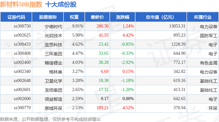 新材料50R(470042)指数十大成份股详情如下: