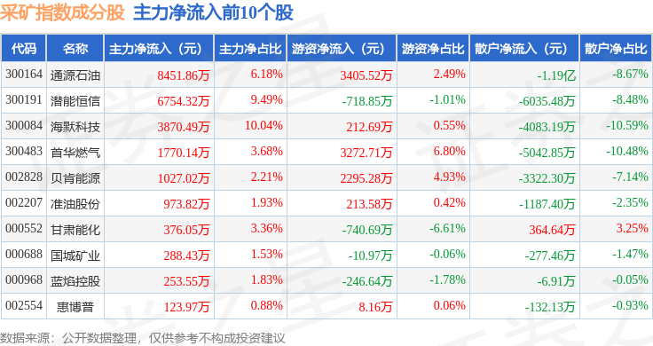 资金流向方面,采矿指数(399232)成份股当日主力资金净流出合计3.65亿元,游资资金净流入合计1.89亿元,散户资金净流入合计1.76亿元。成份股资金流向详情见下表: