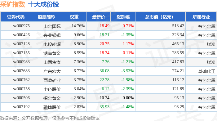 采矿指数(399232)十大成份股详情如下: