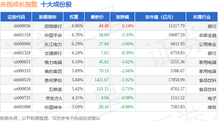 证券之星消息,7月31日,央视成长(399552)指数报收于7949.75点,跌1.93%,成交638.43亿元,换手率0.82%。当日该指数成份股中,上涨的有1家,招商银行以0.14%的涨幅领涨,下跌的有49家,万科A以3.88%的跌幅领跌。