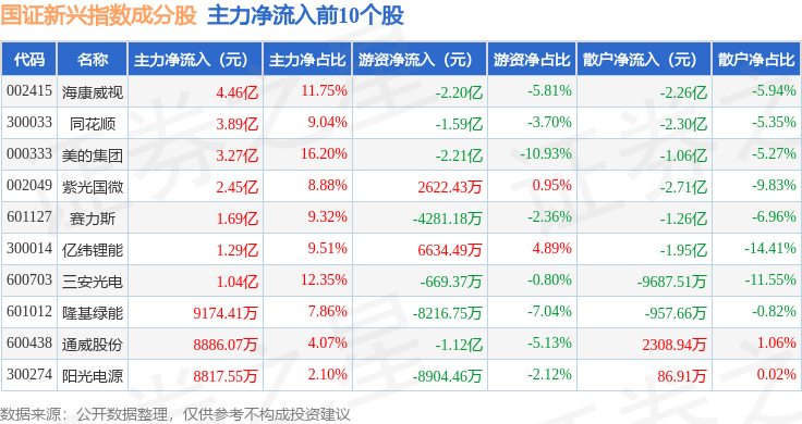 资金流向方面,国证新兴(399392)指数成份股当日主力资金净流出合计97.39亿元,游资资金净流入合计24.86亿元,散户资金净流入合计72.53亿元。成份股资金流向详情见下表: