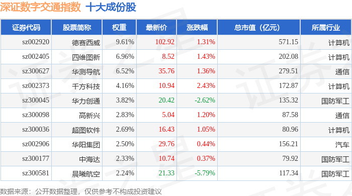 证券之星消息,8月1日,深证数字交通(970049)指数报收于4025.36点,涨0.98%,成交201.11亿元,换手率2.79%。当日该指数成份股中,上涨的有37家,东杰智能以20.0%的涨幅领涨,下跌的有12家,晨曦航空以5.79%的跌幅领跌。