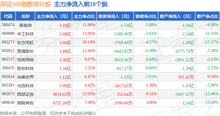 资金流向方面,深证200(399009)指数成份股当日主力资金净流出合计14.39亿元,游资资金净流入合计2.93亿元,散户资金净流入合计11.46亿元。成份股资金流向详情见下表: