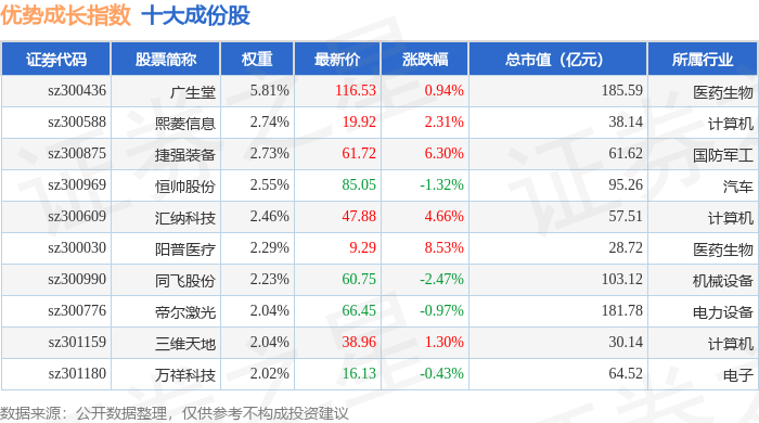 优势成长(399698)指数十大成份股详情如下: