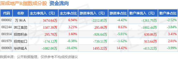 资金流向方面,深成地产R(471001)指数成份股当日主力资金净流入合计4021.69万元,游资资金净流出合计2088.73万元,散户资金净流出合计1932.95万元。成份股资金流向详情见下表: