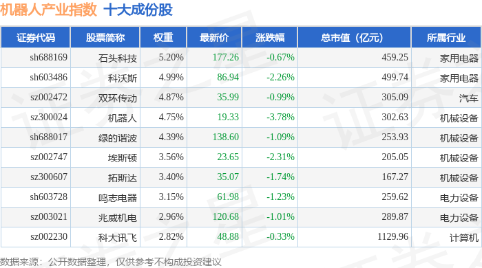 机器人产业(980022)指数十大成份股详情如下: