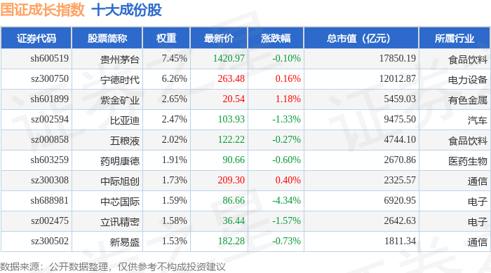国证成长(399370)指数十大成份股详情如下: