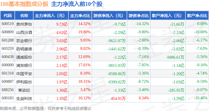 资金流向方面,180基本(000053)指数成份股当日主力资金净流出合计9404.26万元,游资资金净流出合计2.54亿元,散户资金净流入合计3.48亿元。成份股资金流向详情见下表: