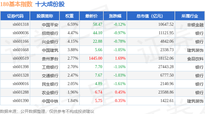 180基本(000053)指数十大成份股详情如下: