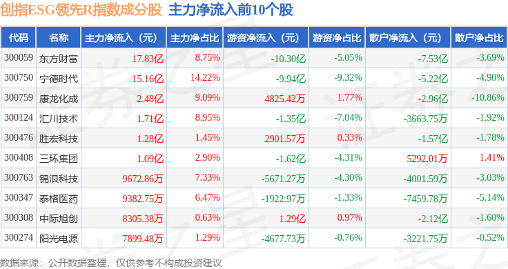 资金流向方面,创指ESG领先R(470031)指数成份股当日主力资金净流入合计37.35亿元,游资资金净流出合计22.67亿元,散户资金净流出合计14.67亿元。成份股资金流向详情见下表: