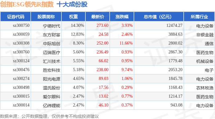 创指ESG领先R(470031)指数十大成份股详情如下: