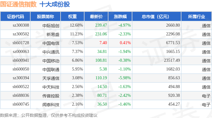 证券之星消息,8月14日,国证通信(399389)指数报收于5718.99点,跌2.4%,成交956.57亿元,换手率1.92%。当日该指数成份股中,上涨的有10家,东信和平以5.16%的涨幅领涨,下跌的有60家,仕佳光子以8.3%的跌幅领跌。