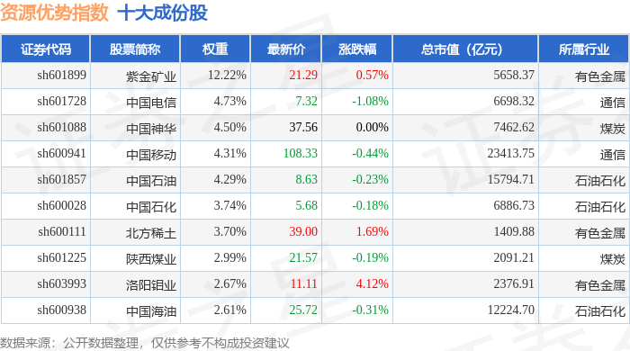 资金流向方面,资源优势(399319)指数成份股当日主力资金净流入合计11.2亿元,游资资金净流出合计6.84亿元,散户资金净流出合计4.36亿元。成份股资金流向详情见下表: